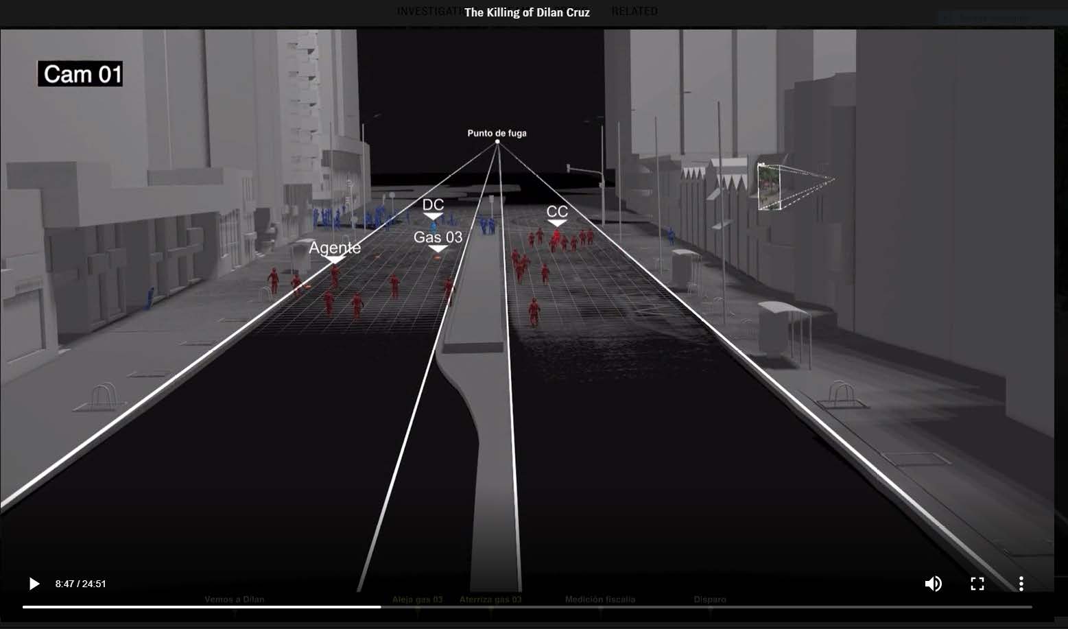 Nuestra investigación llega a la conclusión opuesta. Ubicamos los mismos videos usados por la Fiscalía, que hacen parte del caso jurídico, en un modelo tridimensional. Usamos una serie de métodos avanzados de análisis visual y espacial, que no permiten decir que hay más que suficiente evidencia visual que apoya la tesis de que Dilan -y no la “turba”- era el objetivo de Cubillos. Demostramos cómo el Capitán Cubillos siguió los movimientos de Dilan Cruz con su arma antes de disparar. La sincronización espacio-temporal del material audiovisual nos permitió establecer una relación entre el movimiento de Dilan y el de Capitán Cubillos mientras levanta su arma, una coreografía de movimientos donde Cubillos responde al movimiento de Dilan (Forensic Architecture, 2023.s.p).