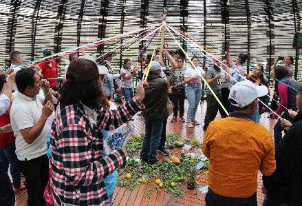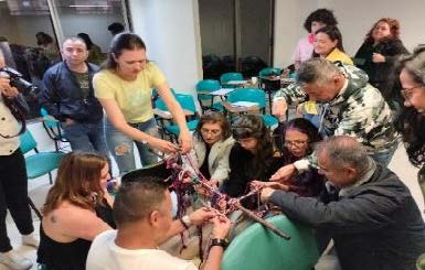 Posteriormente, se propuso a los asistentes ofrecer un alimento (solicitado previamente) que debía ser ubicado en el centro de la maloca. Luego, se llevó a cabo un ejercicio de juego dramático alrededor de los alimentos y un bastón de mando indígena que obligó al grupo a realizar contacto corporal y entrelazar cintas de colores (figura 5). La experiencia resultó grata para los participantes y propició canales de comunicación entre las dos partes. Sobre la experiencia, algunos afirmaron: