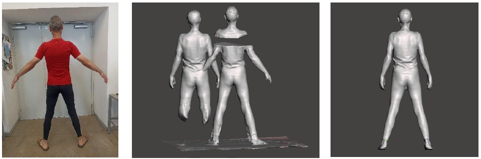 En la primera fase se trabaja directamente con modelo real, escaneando su cuerpo en tres partes (inferior, superior y cabeza) mediante un escáner de bajo coste 3DSense, con objeto de generar la copia digital de cada persona lo más adaptada posible a la realidad. Los escaneos 3D requieren un posterior procesamiento con programas CAD, por lo que, en este caso, se ha utilizado el programa gratuito Meshmixer (Fig. 3).