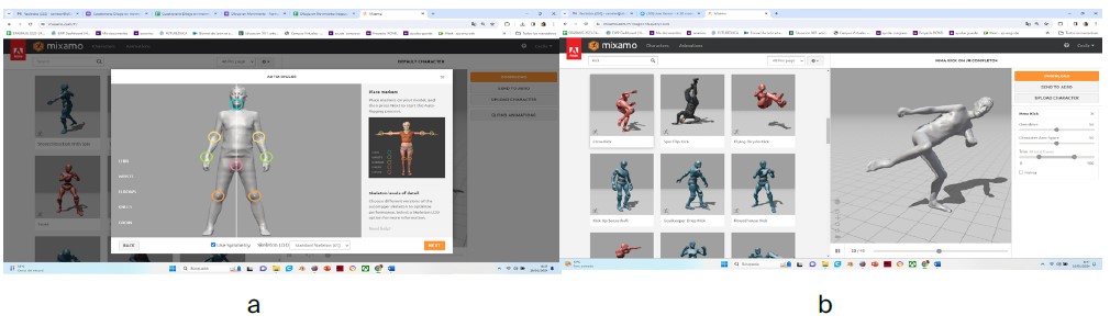 A continuación, se pasa a la fase de animación de la figura 3D. Esto puede suponer un trabajo largo y costoso si se realiza paso a paso a través de un programa de animación. Para este proyecto se ha usado la aplicación online llamada Mixamo.com; una herramienta online, con la que se pueden crear animaciones 3D sin ninguna experiencia previa en estas técnicas, obteniéndose personajes animados al instante (Blackman, 2014). En este programa se pueden aplicar puntos de referencia a un personaje 3D que generan un esqueleto de forma automática (Fig. 4a) y a continuación añadir el movimiento elegido de una librería muy extensa de animaciones preestablecidas (Fig. 4b). Los modelos creados pueden ser utilizados en una gran variedad de motores de videojuegos y otras aplicaciones.