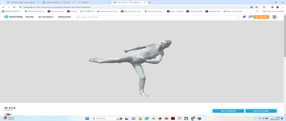 Una vez damos con el movimiento deseado y hemos extraído el lapso de tiempo correcto, se descarga la animación obtenida en formato FBX ASCII para continuar con el proceso. El modelo descargado se importa en el programa online Sketchfab.com; un repositorio especializado en objetos 3D, que permite la visualización e interacción directa en el entorno online a través del propio navegador, sin necesidad de tener instalada ninguna aplicación. Para subir modelos únicamente es necesario registrarse y se pueden incorporar animaciones de manera sencilla y gratuita. No obstante, plantea algunos límites, como el tamaño o la cantidad de los modelos que se pueden cargar. Aunque, por otro lado, ofrece otras opciones bastante útiles, como la posibilidad de editar la iluminación, los fondos y variar la velocidad. Una vez configuradas las poses, éstas se pueden difundir entre el alumnado de forma gratuita, mediante un enlace, pudiendo visualizarlas directamente en 3D a través de cualquier dispositivo con conexión a internet (Fig. 5a y 5b).