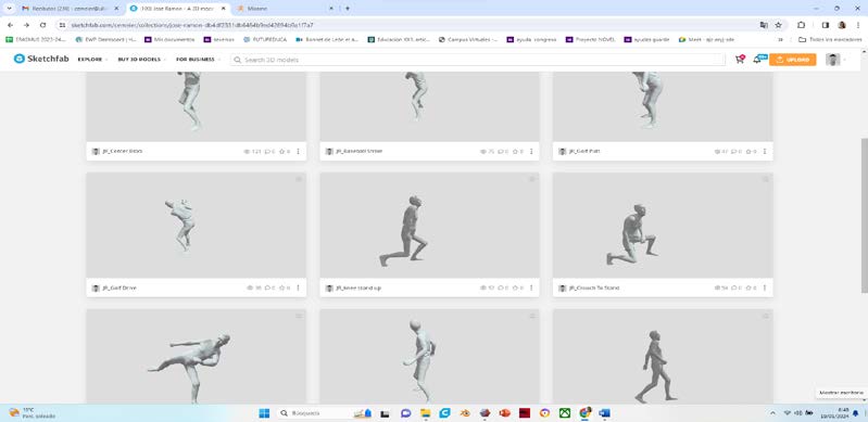Se ha realizado el escaneo del cuerpo por tramos de cada uno de los modelos que posan en la asignatura de Dibujo II, con su posterior procesamiento en un programa de modelado 3D. Posteriormente, cada uno de los escaneados ha sido tratado en el programa Mixamo para animarlo. Para finalizar, se ha configurado un repositorio con un total de 9 animaciones por modelo. Este conjunto consta, por un lado, de 3 movimientos fácilmente replicables por el modelo en el aula y, por otro lado, 6 movimientos demasiado complejos para repetir durante varios minutos. De esta manera, gracias a la herramienta, es posible ampliar el el abanico de acciones practicadas en clase.
