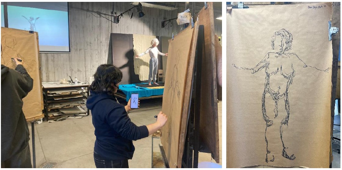 Se comienza con la primera parte: una sesión presencial de 2 horas, basada en una metodología de enseñanza directa, donde la docente realiza una introducción sobre el tema, utilizando material visual como ejemplo para desarrollar los ejercicios en clase. Seguidamente se imparten instrucciones técnicas sobre la ejecución de los dibujos. También en esa sesión, se muestra el recurso digital y sus diferentes posibilidades. Es entonces cuando se pasa a la práctica presencial mediante la sincronización del movimiento del modelo escaneado, proyectado en el aula, con el modelo real en clase. En todas las poses los movimientos de ambos modelos, real y digital se simultanean, sirviendo el modelo 3D de guía al modelo real, quien realiza en la tarima idénticas acciones que la proyección. Estas poses dinámicas tienen 5 minutos de duración y se dibujan en papel de tamaño de 100x70 cm cada una, aplicando lo aprendido durante la explicación de la docente y obteniendo unos 5 dibujos aproximadamente (Fig. 6). Tras cada dibujo, se llevan a cabo evaluaciones grupales de una selección de los resultados. Por otra parte, a lo largo de la práctica, cuando el alumnado topa con cierta dificultad, se realizan algunas demostraciones por parte de la docente. Esta sesión en el aula sirve para integrar el recurso digital en la práctica de la asignatura y comprender su conexión con el movimiento del natural.