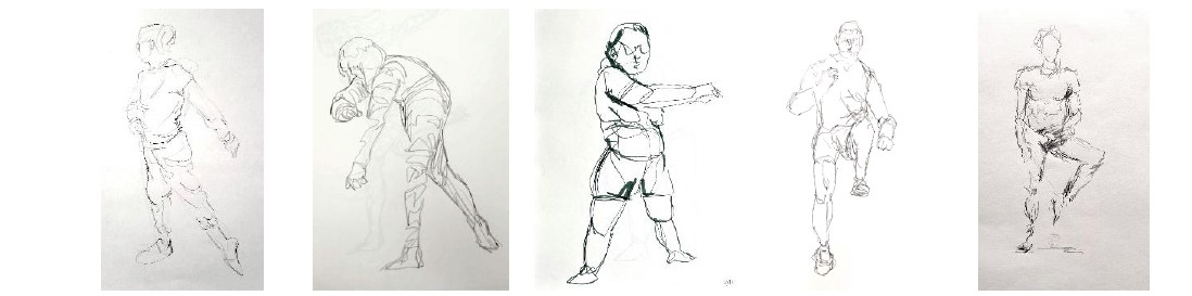 La última parte de esta experiencia consistirá en dibujar figuras en movimiento del natural, en formato DIN A3, durante otras 3 semanas, a partir de modelos no profesionales tanto en un entorno doméstico más controlado como en un entorno externo sujeto a contingencias, exponiéndose a la falta de control que implica ese medio (Fig. 8). Cada estudiante realizará de nuevo una media de 15 dibujos en total. De esta manera, se pretende que el entrenamiento llevado a cabo con los modelos 3D sirva de ensayo y afianzamiento de las bases para enfrentarse a un entorno real, con una mayor variabilidad y cuya casuística requiere flexibilidad y preparación. Al igual que en la anterior tarea, las tutorías funcionaron como un espacio de orientación en la consecución de esta serie de dibujos.