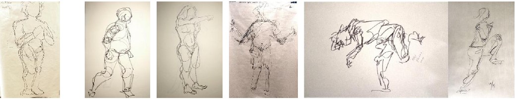 […] los ejercicios de dibujo de movimiento promueven el desarrollo de unas destrezas perceptivas y representativas que, aunque estén condicionadas por una cierta instantaneidad, sin apenas tiempo para la reflexión, no significa que los elementos morfológicos captados pertenezcan al mismo y preciso momento elegido. En consecuencia, ese momento representado es el resultado de varias instantáneas aproximadas que se fusionan en una sola (2007, p. 267).