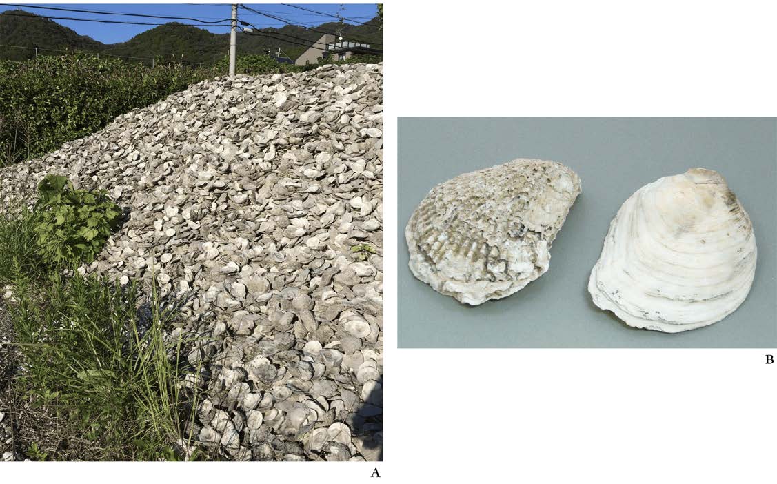 Meteorización. Las conchas de las ostras se apilan al aire libre al menos diez años (Hayashi y Hakoza- ki, 2002, p. 31) (Fig 4A). Este proceso elimina las sales contenidas en ellas y permite que la materia orgánica adherida a la superficie se descomponga naturalmente (Fig 4B). Además, este proceso contribuye a que las conchas se vuelvan más frágiles, lo que facilita su procesamiento posterior.