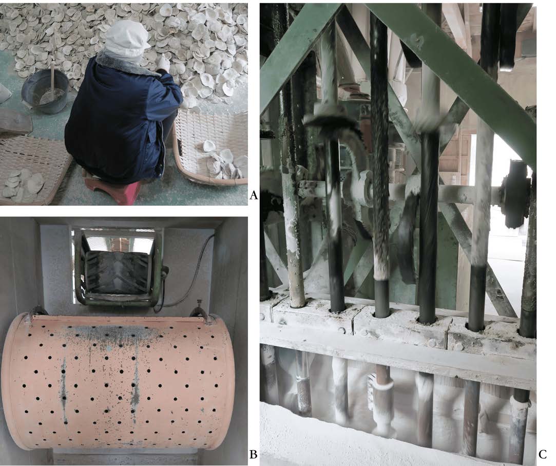 Limpieza superficial. Se retiran manualmente las impurezas que no se han eliminado durante la me- teorización. Luego las conchas se colocan en una máquina pulidora llamada kaiguruma (en japonés, かいぐるま) (Fig. 5B) y se añade agua (Hirayama et al., 2010, p. 48). Mediante un movimiento rotatorio, las conchas se golpean entre sí para eliminar cualquier impureza. Además de limpiar las conchas, la superficie se blanquea y suaviza. Finalmente, se dejan secar durante varios días.