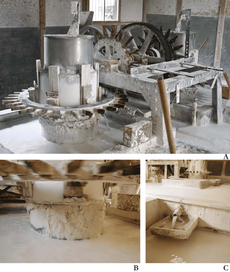 Molienda húmeda y elutriación hidráulica. El polvo de concha se mezcla con agua para formar una suspensión, que luego se vierte en un mortero de piedra con un peso de 450 kg (Fig. 6A y 6B). En este mortero, equipado con un agitador, se lleva a cabo la molienda para conseguir una mezcla uniforme. El líquido resultante, que contiene el polvo de las conchas, se canaliza hacia un primer tanque de sedimentación (Fig. 6C). Allí las partículas más finas de la capa superior se transfieren a un segundo tanque a través de unos conductos. En este segundo tanque tiene lugar el proceso de elutriación hidráulica, mediante el cual se separan las partículas según su velocidad de sedimentación en el agua (Hirayama et al., 2010, p. 48; Sakai, 2006, pp. 58-9). Las partículas más finas pasan a un tercer tanque, que almacena aquellas con el tamaño requerido para el gofun.
