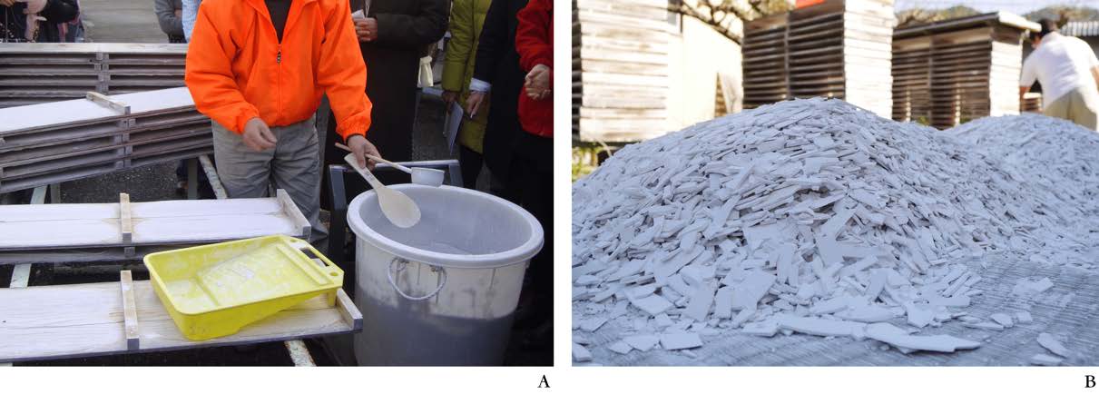 Secado y producto final. El polvo se extiende en capas finas sobre tablas de cedro y se seca al sol durante unos diez días (Sakai, 2006, pp. 58-9) (Fig. 7A). Una vez seco, el gofun se desprende en forma de láminas. Para ello, se golpean las tablas de cedro. El proceso de secado se lleva a cabo en días soleados (Fig. 7B), entre primavera y otoño.