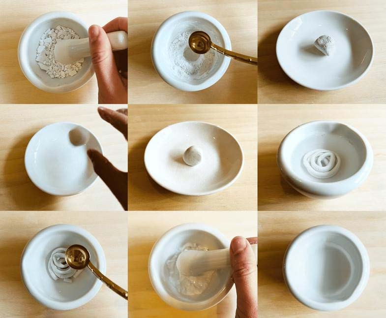 Molienda. El gofun se coloca en un mortero de cerámica y se tritura con un movimiento giratorio desde el exterior hacia el interior, hasta que las partículas se reduzcan completamente a polvo.