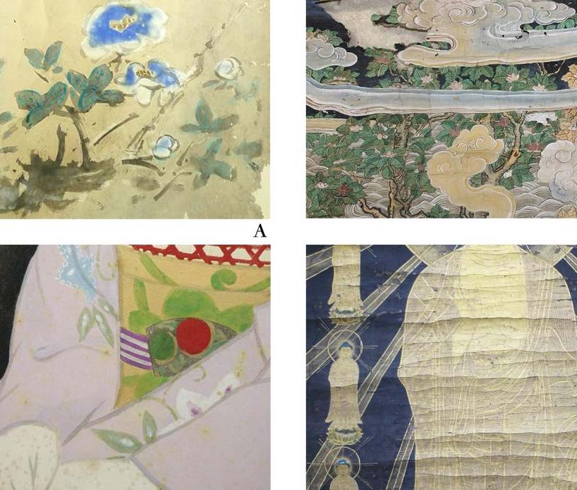 El uso inadecuado del aglutinante también genera problemas de conservación. Por ejemplo, un exceso del aglutinante animal puede dejar marcas visibles en la superficie de la pintura y hacer que el gofun se vuelva quebradizo y propenso a las grietas (Fig. 9B). Asimismo, el calentamiento repetido de la solución de cola reduce la adhesividad y aumenta el riesgo de desprendimiento tanto del gofun como de otros pigmentos (Lin, 2000, pp. 52-3).