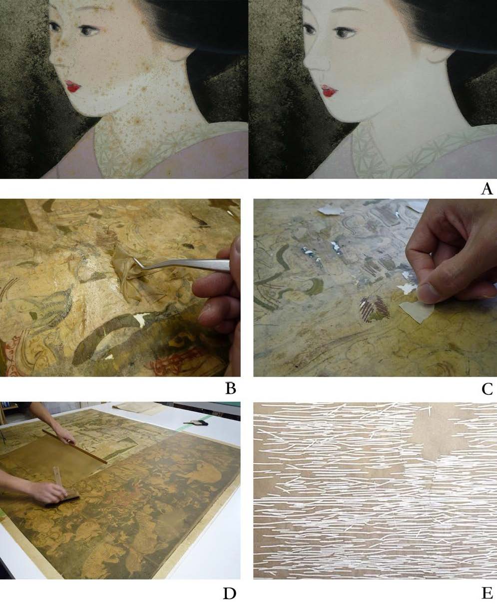 El gofun se aplica, tradicionalmente, sobre el washi6 o seda. A continuación, se describe el proceso estándar de restauración para estos soportes, con ajustes según el estado de deterioro de la obra: