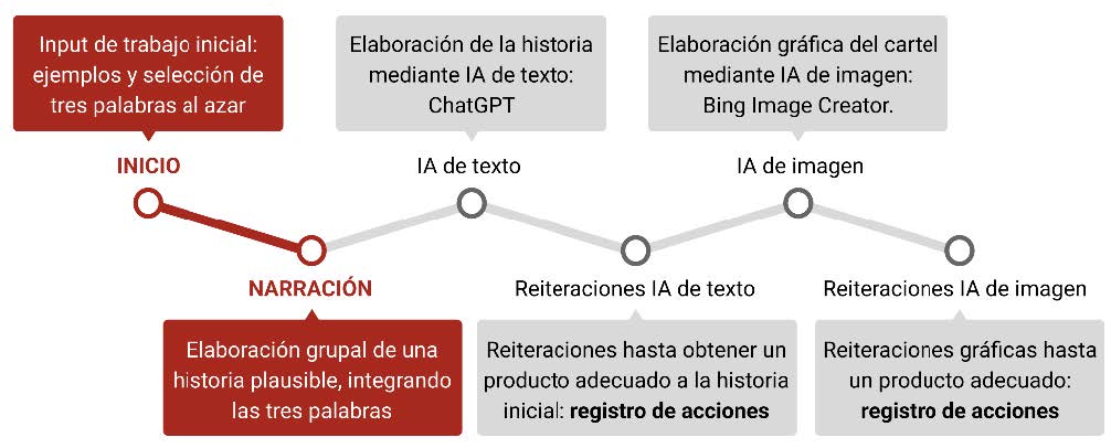 Como variante, dentro de esta dinámica de actuación, se introduce la IA para tratarla como un elemento diferenciador por poseer una gran potencialidad para utilizarse dentro de las metodologías creativas de enseñanza tradicionales. De esta forma se le atribuye gran parte del peso final de la propuesta, mientras se desliza el interés hacia otros procesos cognitivos distintos al de la creatividad, como son el razonamiento, la planificación, la flexibilidad y la toma de decisiones. En la Figura 1 se muestra un esquema básico que representaría la secuencia de actuación. Como se puede observar, el inicio de la dinámica reside en una acción docente en donde se muestran y se analizan ejemplos de carteles seleccionados por su pertinencia, en relación con las temáticas que se han tratado en la enseñanza del lenguaje visual y plástico. También se asignan palabras creadas al azar a cada uno de los grupos intervinientes. A continuación, se elabora una sinopsis integrando estas tres palabras asignadas en un texto breve, para después, comenzar con la elaboración de texto y de imágenes a través de las distintas IA mencionadas, registrando las acciones que se han llevado a cabo.