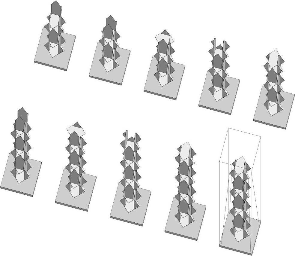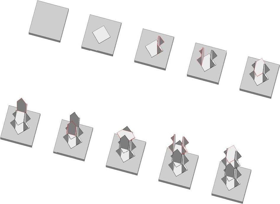 Sobre cada dos módulos verticales se posiciona un módulo horizontal, obtenido también del mismo cuadrado, con la novedad de que en este caso contiene sólo sendos pliegues triangulares. Elementos que se solapan con las chapas verticales hasta compartir los vértices que marcan la máxima altura de la pieza. Esta misma operación se repite rítmicamente tras aplicar una rotación de 90 grados en cada nuevo nivel añadido, hasta alcanzar una elevación de siete alturas que le confieren una apariencia de torre arquitectónica.