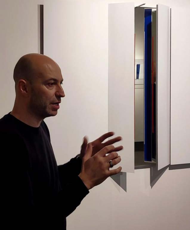 La escultura Porta oberta a l’invisible (2019) constituye el único caso de estudio seleccionado que no es completamente exenta, sino que se dispone adosada al plano vertical del soporte. Forma parte de una familia de obras que se desarrolla desde 2016, cuyas últimas realizaciones, tituladas Portes múltiples, desvelan las caras ocultas de los planos de la pieza e incorporan al espectador. Una característica lograda gracias a los reflejos que proporcionan las superficies de espejo, que produce un diálogo autorreferencial con el observador (Fig. 1).