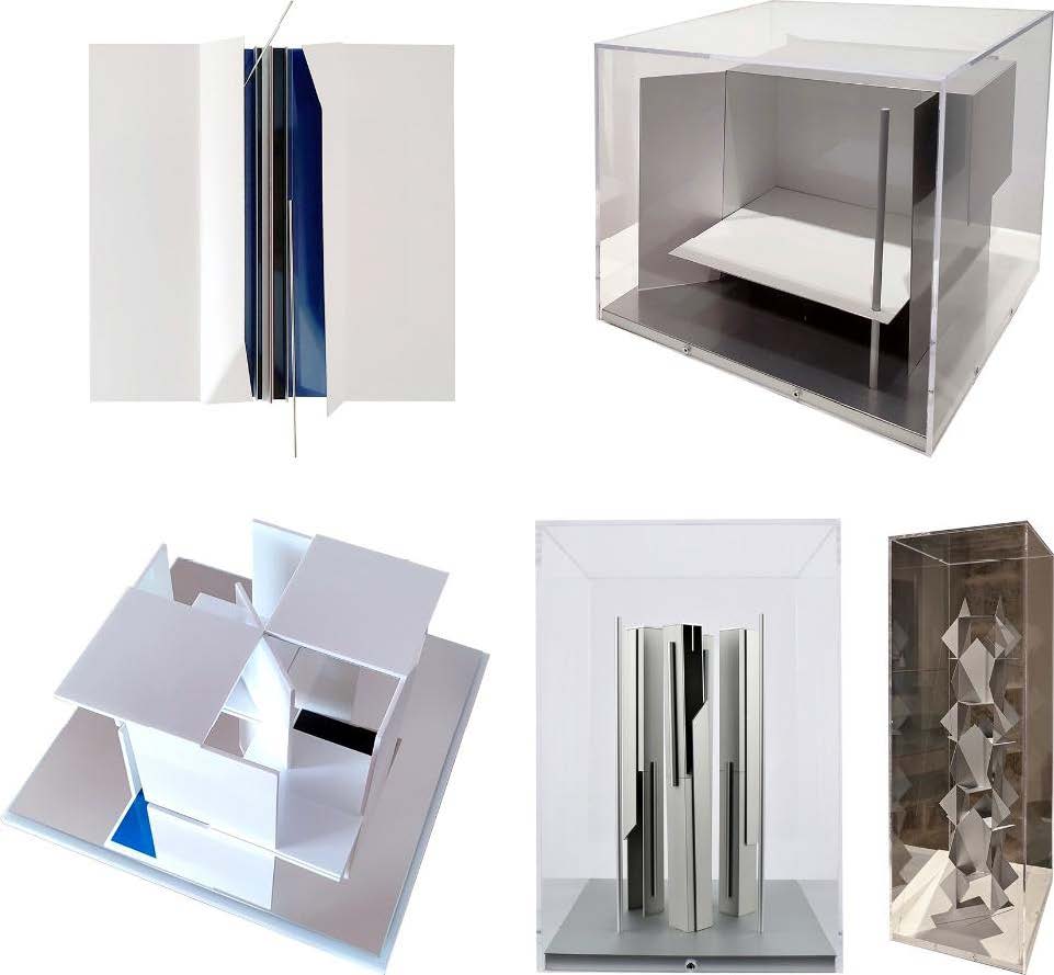 Confinada en una caja de metacrilato, se despliega la sucesión de planos metálicos en composite que configuran la escultura Construccions-Destrucció nº 9, realizada en 2019. En esta obra se descubren diversas maneras de conformar el espacio a partir de un escueto abanico de elementos hasta conformar una suerte de pabellón. Robert Ferrer opera principalmente con planos plegados a los que se complementa con un solitario pilar cilíndrico (Fig. 6, primera fila).