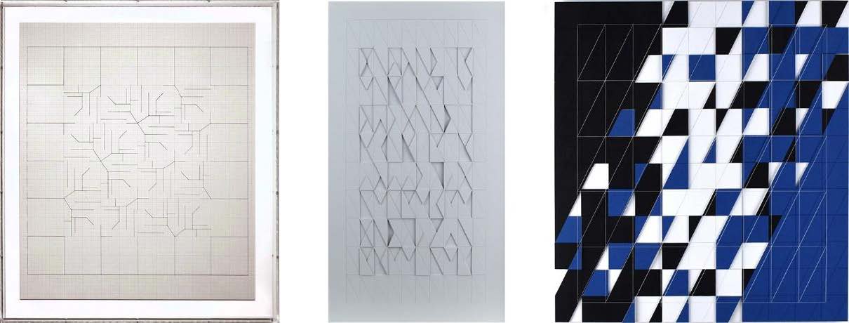 Aunque despliega una producción escultórica, actualmente también incorpora algunas obras dibujadas sobre papel milimetrado. En estos diseños las líneas representan direcciones y energías dentro de un espacio implicado, como defendía el físico David Bohm (Bohm y Peat, 1988), donde la unidad simbólica conforma un módulo que opera como origen generador de una composición ordenada en damero mediante una sucesión rítmica (Fig. 3A).