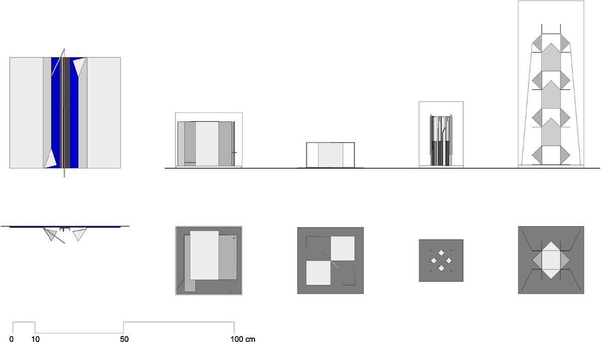 Asimismo, las piezas escogidas para este análisis comparten un argumento arquitectónico: además de investigar el concepto de umbral, estas esculturas funcionan como diseños de pabellones o variaciones de torres construidas a una escala reducida que evolucionan en el tiempo con una depuración que desemboca en soluciones más serenas. Para elaborar el análisis gráfico de las obras objeto de estudio se han tomado unas decisiones de partida que respetan las premisas de la metodología escogida. El análisis comienza con una descripción bidimensional, mediante conjuntos coordinados de plantas y alzados de los cinco casos de estudio, y avanza con series de axonometrías para abordar el conocimiento de cada pieza desde el punto de vista de sus relaciones espaciales.