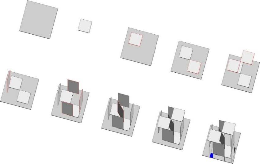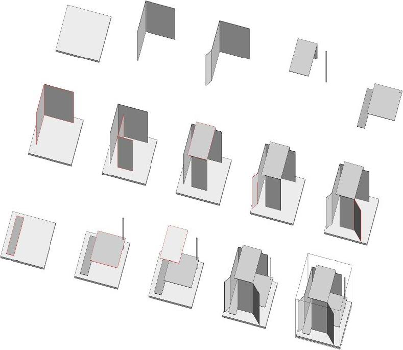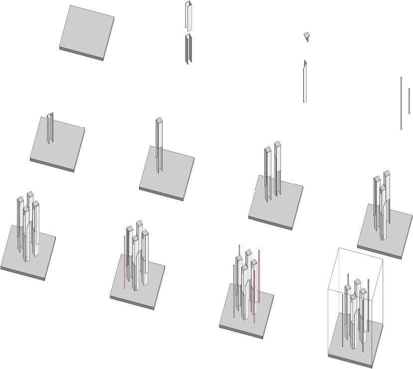 La pieza parece abordar distintas soluciones de materialización y desmaterialización de las esquinas, como configuración de cerramientos y aperturas. Por esta razón se puede distinguir como módulo principal un diedro ortogonal en L, agrupado en sendos conjuntos de planos verticales y un tercero que define la cima de la escultura. La relación entre cada módulo se produce mediante rítmicas operaciones de rotación. A los dos primeros diedros verticales se le añade un tercer plano oblicuo, como contrapunto que refuta la estricta perpendicularidad de la composición (Fig. 6, segunda fila).