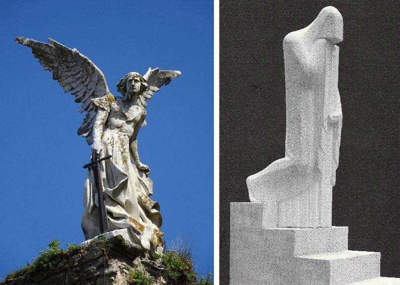 Por su propia entidad y alcance, es lógico asistir a una mayor variedad de propuestas en el monumento urbano. El entorno cementerial limita las posibilidades, ya que tiene que adecuarse a unos fines concretos. En ese sentido, hubo quien supo sacarle provecho. La ciudad portuaria de Génova se especializó en la escultura funeraria y fue un centro de exportación importante. Pero no destaca solo por su actividad comercial, es que de sus talleres partieron repertorios difundidos por medio mundo. Las oficinas asentadas en Carrara asumieron al tiempo una gran proyección, mantenida desde siglos atrás y manejando también modelos muy extendidos. Trabajar con referentes italianos se convirtió en elemento de prestigio, aunque su popularización y copia derivó en obras excesivamente adocenadas, que todavía hoy perviven.