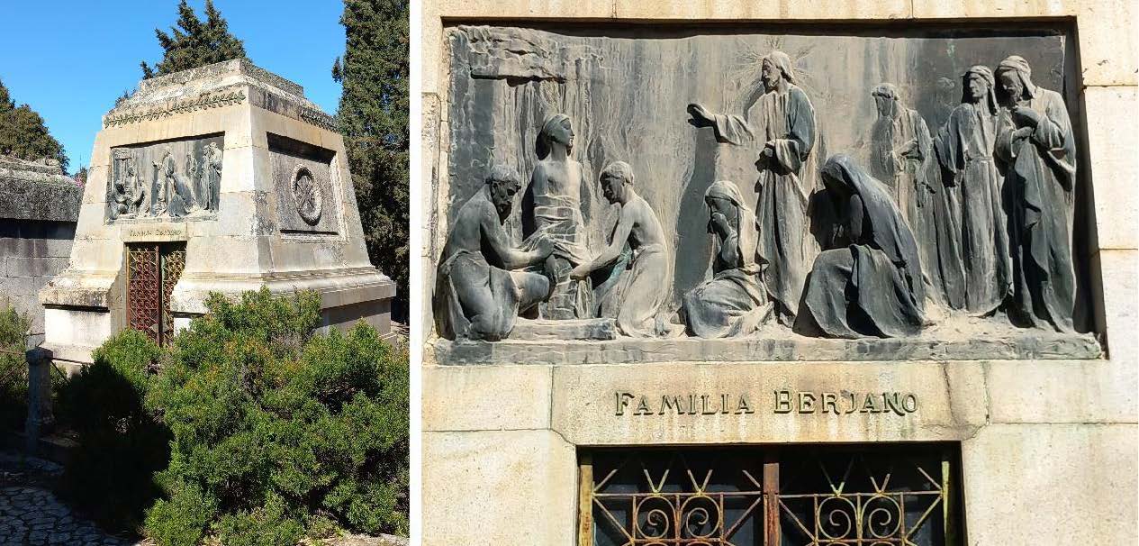 Junto a una de las entradas principales del cementerio se alza el panteón de la familia Berjano (Fig. 4). Es una hermética y potente estructura troncopiramidal, con muros en talud, que simbólicamente afianza la idea de solidez y estabilidad. Ramas con hojas de laurel en bronce rodean la parte superior antes de culminar el remate. En ambos laterales se inscribe un crismón enmarcado por una corona vegetal que incluye las letras Alfa y Omega como símbolo de principio y fin. La puerta de hierro presenta una trama geométrica muy elaborada y en la cerradura la inscripción latina: “Hic sunt Hvmiliata animae sperant in deo amen”. Sobre ella, el frente ostenta el relieve apaisado en bronce que nos ocupa, sin apenas parangón en nuestro ámbito por su calidad y factura.