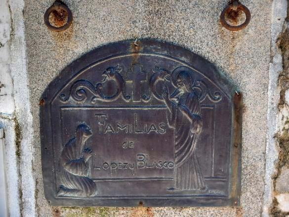 Mucho más modesta en pretensiones y medios es la tumba familiar del artista Eulogio Blasco López en el cementerio de Cáceres (Fig. 5). Es en realidad un nicho a nivel del suelo que ocupa dos alturas y ostenta en su frente una placa en bajorrelieve alusiva a las familias López y Blasco, alterando el orden de los apellidos. El padre, Eulogio, falleció en 1945 y la madre, Consuelo, en 1947; cabe por tanto situarlo en esas fechas.