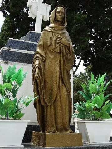 Aún cabe citar otro diseño de Ávalos en el camposanto emeritense. En la tumba Pirrongelli-Crollo (Fig. 7) se alza una reproducción con pátina dorada de la Virgen de la Soledad tallada por el artista en 1975 para un efectista paso de la Semana Santa malagueña (Bazán, 1996, pp. 245-248). Es un ejemplo de traslación religioso-funeraria que apreciaremos también en Hervás.