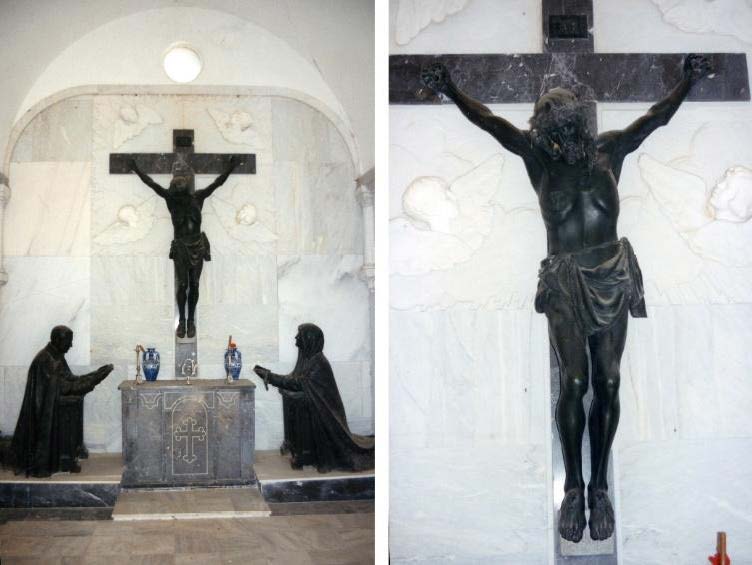 En 1926 aborda un primer gran encargo funerario para la capilla-panteón de Hilario Molina y la Familia Spínola en el camposanto de Azuaga (Fig. 8). El notable conjunto incluye, flanqueando el altar, dos esculturas orantes en bronce arrodilladas sobre sendos reclinatorios. Su factura es realista y la actitud devota y respetuosa. La pared del fondo muestra en relieve cuatro querubines labrados en mármol blanco, que en realidad son retratos de los hijos del matrimonio. Rodean al gran crucificado broncíneo que preside la escena. Es un Cristo de cuatro clavos, fiel a modelos asentados en el Barroco español, con el perizoma sujeto por un cordel. Su complexión es musculosa, con el vientre muy hundido, las costillas marcadas y un rostro de expresión serena.