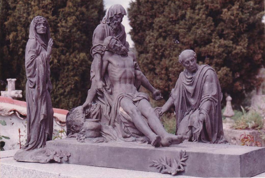 Pero hay un dato singular que personaliza la obra: Comendador retrató a su esposa la pintora Magdalena Leroux en María de Cleofás, y él mismo se encarnó, semiarrodillado, en la figura de José de Arimatea. Lo que en su momento fue un arranque de ensimismamiento cobra más sentido cuando se reutilizó el grupo con fines funerarios. Y es que parte del conjunto en versión reducida se instaló en bronce en su tumba familiar de Hervás (Fig. 10). Para ello debieron utilizarse los modelos previos a escala que sirvieron para la ejecución definitiva del paso procesional en madera. La reproducción fue realizada por su discípulo, el fundidor Eduardo Capa en torno a 1983, por encargo de la viuda de Comendador y se conservan en el Museo fotografías de la instalación.