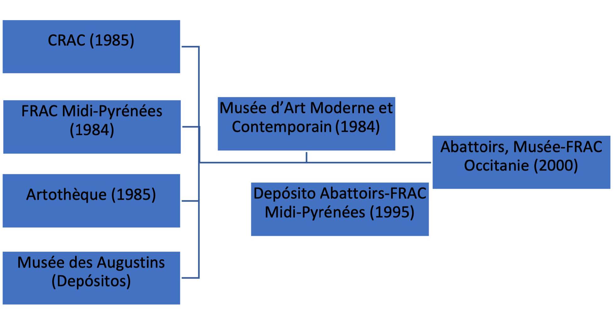 Los Abattoirs, Musée-FRAC Occitanie no abrieron hasta el año 2000, durante las dos décadas anteriores se fue configurando el modelo de gestión actual. Para dar respuesta a los centros de arte contemporáneo que comenzaron a surgir en Francia en 1985, se creó el Centre Régional d’Art Contemporain Midi-Pyrénées (CRAC) en Labège, dirigido también por Alain Mousseigne. Esta efímera institución estuvo activa hasta 1995, siendo absorbida por los Abattoirs, sin embargo, entre las exposiciones que se organizaron hubo una dedicada a Antonio Saura. A partir de 1986 las artothèques ya no solo estaban vinculadas a las bibliotecas, sino también a los centros de arte contemporáneo, pues se recomendó de cara al plan de descentralización que se aproximasen a estas nuevas instituciones en función de su competencia regional, departamental o municipal.