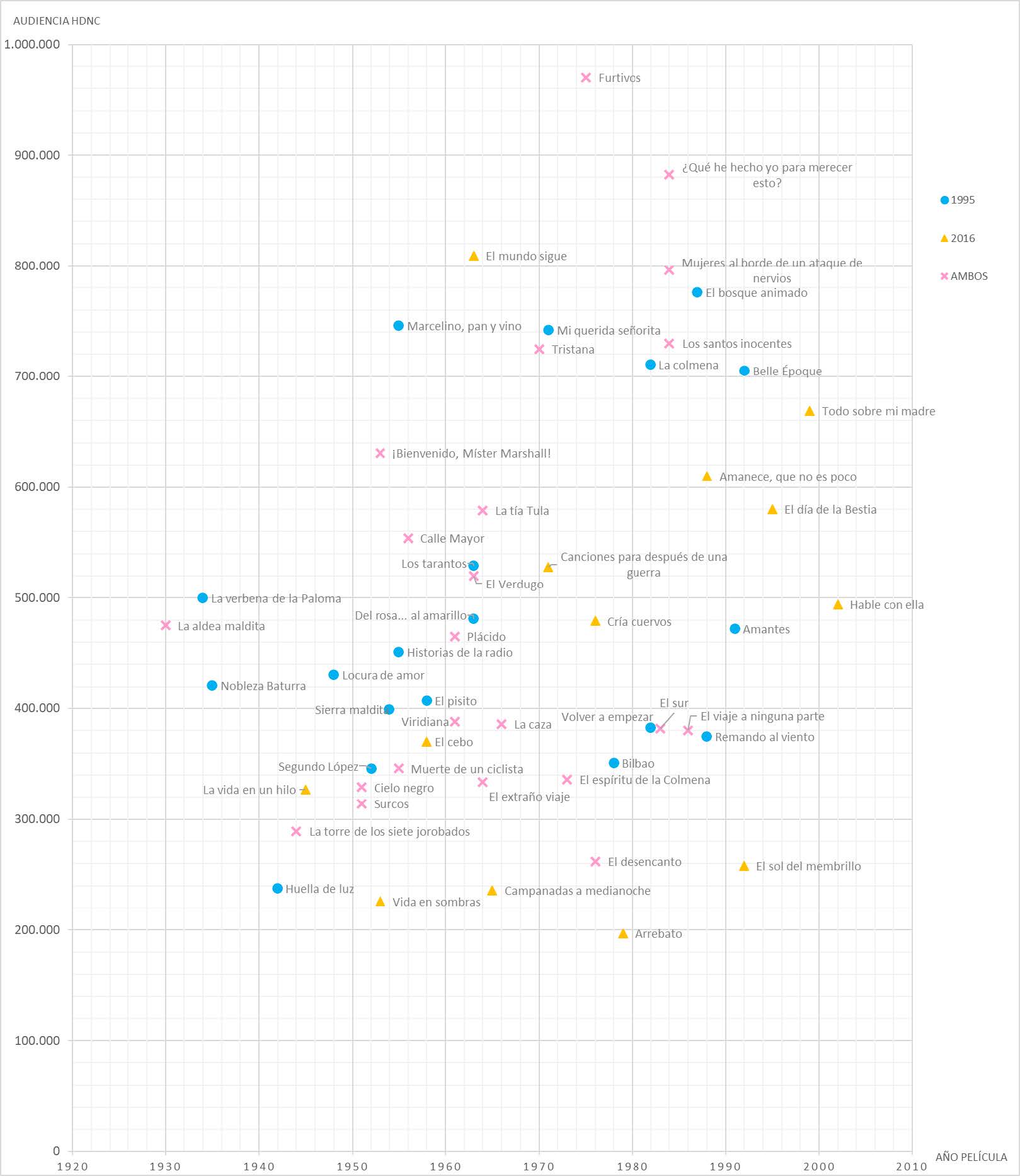 La recopilación de las películas más vistas en el programa televisivo difiere sustancialmente de las que figuran en los primeros puestos de las listas de 1995 y 2016. Destaca en la cabeza del ranking de audiencia la aparición de dos coproducciones como La muerte tenía un precio y Por un puñado de dólares, consideradas españolas por los programadores, pero extranjeras por los impulsores de los cánones. Asimismo, figuran en la lista películas muy populares, pero desdeñadas por los prescriptores. Son títulos muy ligados a la condición estelar de sus intérpretes. Tal sería el caso de estrellas como Lina Morgan (La tonta del bote) o Esteso y Pajares (Los bingueros). Más allá de la comedia, observamos una notable presencia del conocido como Cine Quinqui, y de películas de género negro y criminal. El cine de Pedro Almodóvar también goza de mayor favor de la audiencia que de los prescriptores. Hay elecciones de la audiencia inesperadas, como incluir entre las más vistas películas tan alejadas de los cánones como La insólita y gloriosa hazaña del cipote de Archidona o Luna de lobos. Más comprensible resulta la aparición en el Top 10 de Operación Ogro. Desde las acerbas críticas en redes sociales de determinados políticos a la programación de un ejemplo de cine fascista como Sin novedad en El Alcázar (Augusto Genina, 1940), la programación de películas de gran carga política suscitó una elevada expectación. Relevante es que un autor que no figura en el canon, como José Luis García Sánchez, goce de tan buena aceptación entre el público.