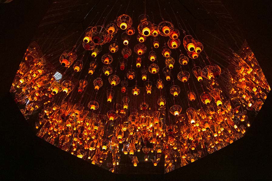 Es importante destacar que esta obra en particular se exhibe en una sala diseñada para invitar al espectador a participar en ciertos rituales, como agacharse para entrar por una pequeña puerta o quitarse los zapatos para sentir la conexión con la tierra antes de mirar hacia arriba, donde se encuentra un dispositivo geométrico cuidadosamente diseñado con flores de cristal soplado.