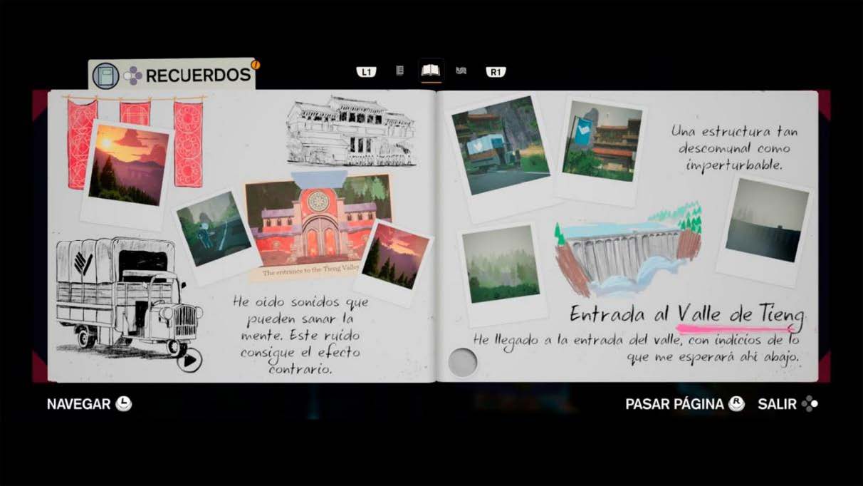 Las fotografías, los dibujos y los sonidos forman parte de un archivador o un diario que cobra protagonismo como un objeto que determina la dinámica de estos videojuegos. Hemos mencionado que en Natsu-Mon el jugador puede determinar el tono y los sellos de cada página del diario, pero también detectamos un amplio grado de personalización en Season y Dordogne. Mientras que en Dordogne este objeto se utiliza como nexo entre dos tiempos —si revivimos el pasado es gracias a que la protagonista, en su versión adulta, encuentra el diario—, en Season encarna el objetivo y la motivación tanto de Estelle como del jugador: no solo tratamos de plasmar lo que nos gusta del mundo que nos envuelve, sino que nuestra misión consiste en documentarlo para sobrevivir a la desmemoria de la humanidad (Fig. 5 y 6). El diario se convierte así en un objeto estrechamente vinculado a la narrativa (Martín-Núñez y Planes-Cortell, 2015), que busca la credibilidad del mundo ficcional a la par que la relevancia para la trama.