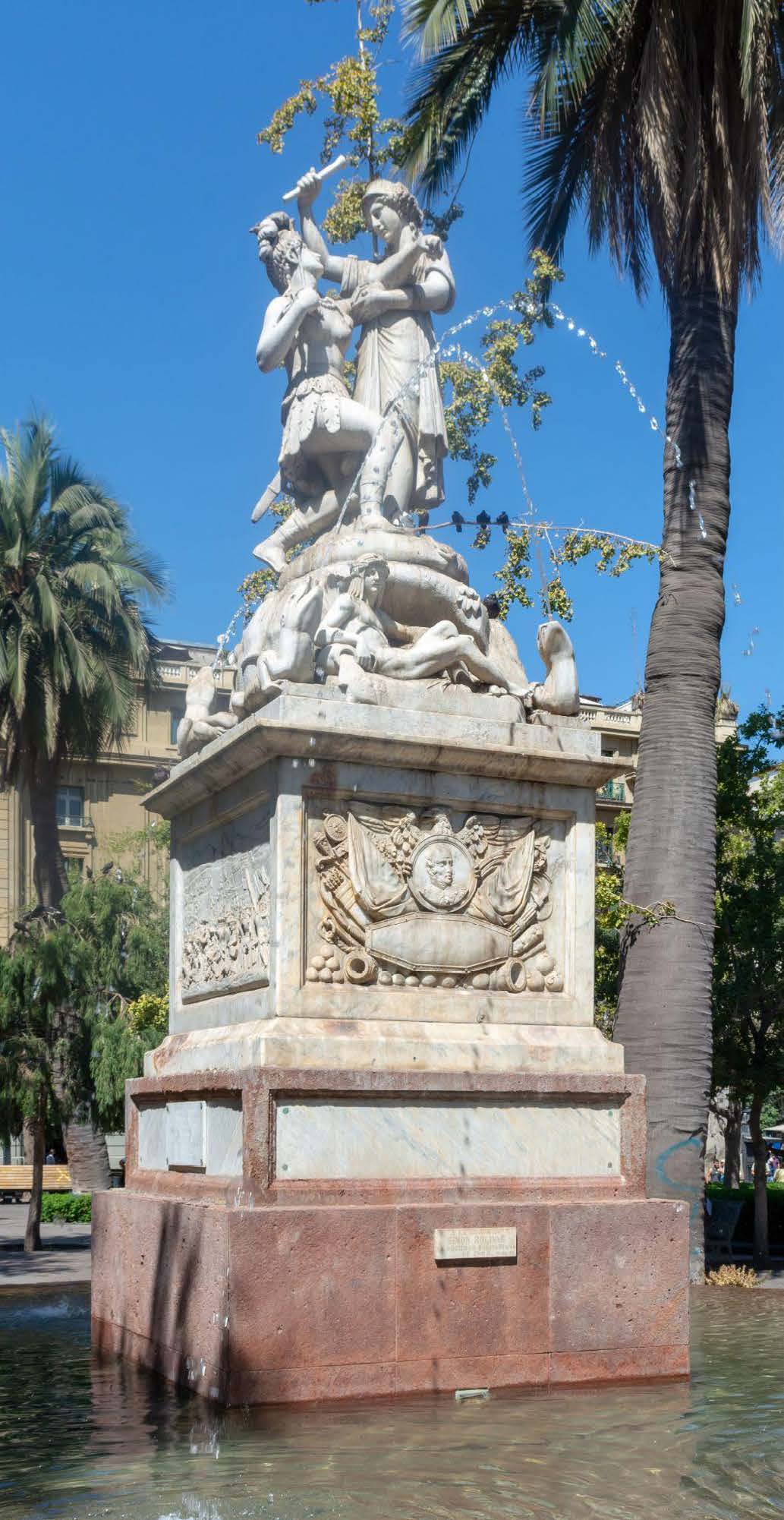 En el caso de la fuente santiaguina, Minerva y una India vestida a lo grecorromano son las dos figuras representadas en un falso antropológico esculpido en mármol que retrataba respectivamente a Europa y América. Desde Honour (1975) a Sanfuentes (2004), la historiografía ha demostrado que la alegoría de la India como personificación del Continente había sido una convención iconográfica difusa en Europa y América desde la época colonial. Las implicaciones ideológicas derivadas de que un escultor italiano represente a una figura femenina indígena como alegoría de América difieren sustancialmente según el contexto de activación simbólica de la obra: concebida en Italia, responde a un imaginario externo sobre el continente; emplazada en el espacio público chileno, se reconfigura en diálogo con narrativas y reivindicaciones locales, memorias colectivas y tensiones históricas.