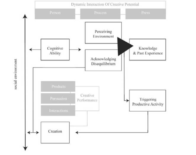 Bajo este modelo, se describen los procesos creativos bajo la siguiente secuencia de acontecimientos: 1) La cognición de un individuo interactúa con el entorno social, 2) Percibe el entorno de cierta manera, 3) Reconoce desequilibrios en el entorno o dominio 4) Interactúa con las experiencias y conocimientos pasados del individuo. Esto desencadena la creación de imágenes en forma de actividades productivas o creativas. Posteriormente, la actividad productiva puede llevar a una creación. Esta creación, a su vez, interactúa con el entorno y proporciona retroalimentación a los creadores, que, si es desfavorable, puede implicar el reconocimiento de desequilibrios dentro de su propia creación. Esto puede llevar a reiniciar el proceso o al abandono. La creatividad, por tanto, es un acto que surge de una percepción del entorno que reconoce un cierto desequilibrio, resultando en una actividad productiva que desafía los procesos de pensamiento y normas establecidas, y da lugar a algo nuevo en forma de un objeto físico o incluso una construcción mental o emocional (Walia, 2019).