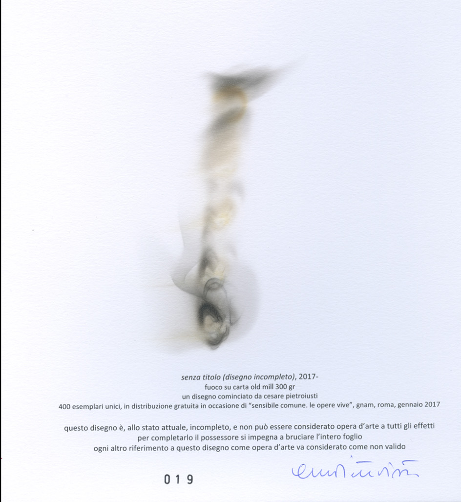 LA: Tu serie de Dibujos incompletos con técnicas efímeras (fuego, polvo, líquidos…) (figura 1) son una prueba de ello. Los distribuyes gratuitamente añadiendo instrucciones para quien los recibe (por ejemplo: quemarlo, regalarlo, etc.). De esta forma la obra se completa con la acción del público. ¿Por qué los distribuyes gratuitamente?