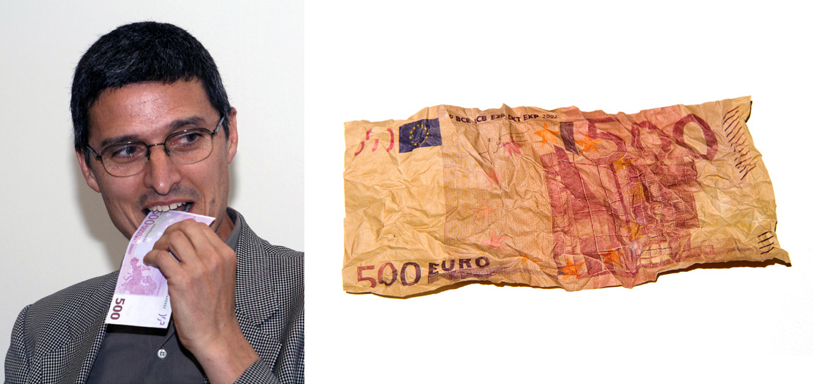 CP: Surgió sobre todo de la idea de considerar el billete como un objeto físico y no solo como el símbolo de un valor abstracto, numérico. He hecho la performance varias veces. Aquella vez, cuando la subasta había llegado a 505€, tuve que tragarme el billete de 500€ que es bastante grande y el estómago claramente sufrió un poco. También está el lado alquímico de las heces que se transforman en oro, en valor simbólico. Pero es sobre todo la experiencia de in-corporar un elemento que da valor a lo físico y por tanto a los sentidos, incluso en forma de dolor, de náuseas. Esta incorporación es un conocimiento que parte del cuerpo. Pensamos que el conocimiento es sólo un hecho mental, pero en realidad, como dice Spinoza, ninguna idea, ningún conocimiento nace si no hay un cuerpo que lo haga nacer, si no hay un aparato sensorial, táctil, etc. que lo construya físicamente. Es una prueba de que el conocimiento se produce a través de sensaciones viscerales.