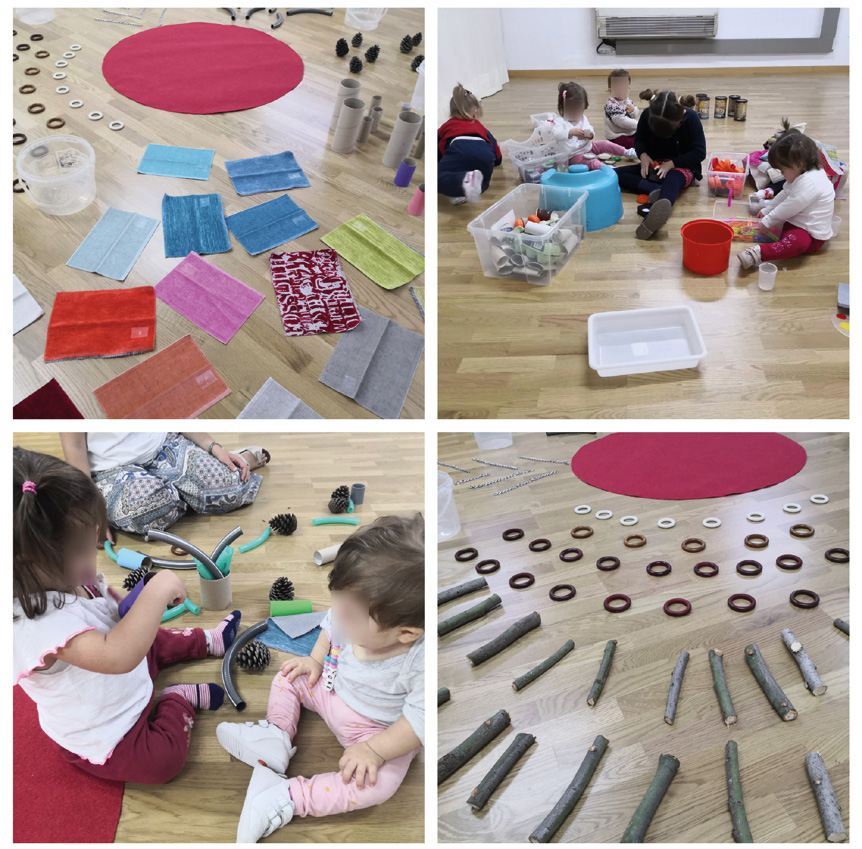 El primer conjunto de talleres que realizamos se centró en el trabajo con piezas sueltas y materiales no estructurados, entendiendo las piezas sueltas como materias primas con las que construir y crear todo tipo de formas complejas a través de elementos básicos. Para ello, diseñamos una instalación circular en la que presentamos de manera ordenada un conjunto de materiales y objetos sugestivos y polivalentes, entre los que destacamos: telas con diferentes texturas, botes vacíos, tapones, anillas de diferentes tamaños, tubos de cartón, tubos de goma y elementos naturales variados entre otros. Además de los objetos, también colocamos contenedores, con la finalidad de que el infante pudiera diferenciar entre continente y contenido. Todos estos objetos podían combinarse de múltiples maneras, favoreciendo la creación, disposición o construcción libre del infante. Permitiéndoles deshacer el orden inicial para crear nuevos órdenes, habitando el espacio desde su acción creadora y reafirmar su propio escenario de juego (Fig.1). Según Priscila Vela y Mercedes Herrán: «Las piezas sueltas son una herramienta fantástica para crear una convivencia viva sobre el valor del material y sus infinitas posibilidades» (2019, p. 26).