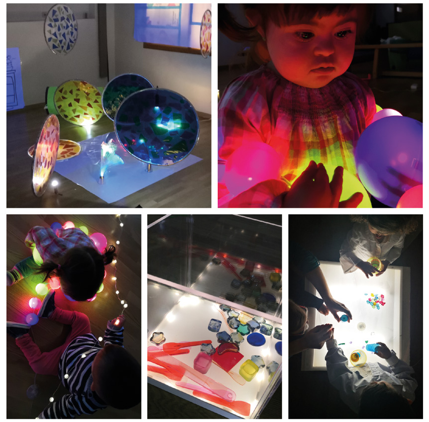 Después del espacio de exploración con la mancha y el color, decidimos construir unos espacios que permitieran jugar con la luz, las sombras y las proyecciones. Como cita visual tomamos las instalaciones artísticas de luz de James Turrel y Olafur Eliasson. En el diseño de estos espacios utilizamos diferentes elementos luminosos, tales como luces de colores led, cajas de luz y elementos con diferentes opacidades que permitían explorar un juego estético de sombras y proyecciones de colores. Estos elementos producían gran atracción en los infantes, invitándolos a un juego libre de exploración con la luz de forma sensorial. En este espacio se dispusieron diferentes áreas en los que los infantes podían explorar con la luz, proyectores donde podían explorar con la sombra de su propio cuerpo, elementos de luz con los que podían construir y componer y una mesa de luz donde podían disponer objetos con diferentes opacidades. Además, los más mayores, también podían utilizar la mesa de luz para pintar y dibujar con rotuladores acrílicos (Fig.3). «Las luces y sombras son un excelente recurso para lograr esa provocación, porque son para los niños un encuentro poético, curioso, volumétrico y lleno de misterio» (Mesías Lerma y Sánchez, 2018, p. 113).