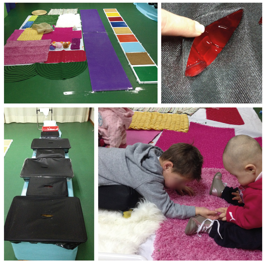 Por último, decidimos dedicar un conjunto de espacios a la exploración con el tacto y las texturas. Como sabemos, las principales herramientas para conectar con nuestro tacto son las manos, pero también nuestro cuerpo. Toda la superficie de la piel que cubre nuestro cuerpo está a disposición de la exploración táctil. Las texturas y los colores atraen a los infantes y sienten la necesidad de acercarse a los objetos para tocarlos, para sentir su textura y su temperatura. En esta propuesta tomamos como citas visuales los libros y los espacios sensoriales de la artista Ligia Clark, así como las instalaciones participativas de Ernesto Neto. En este taller ocupamos todo el espacio del suelo con alfombras y superficies con diferentes texturas. Se trataba de construir un espacio para atravesar, habitar y sentir con toda la superficie de nuestra piel, un espacio para arrastrarse, gatear y caminar con los pies descalzos. También preparamos cajas sensoriales en las que los infantes podían hundir sus manos o sus pies y explorar con los sentidos. Estas cajas disponían de diferentes materiales: leche condensada, gelatina, pasta, garbanzos, algodón, entre otros. (Fig.4)