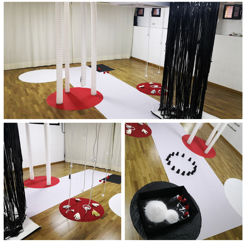 Para diseñar estos ambientes tomamos de nuevo como referencia a la artista brasileña Lygia Clark. El trabajo de esta artista se basa en la relación sensorial del cuerpo y de los objetos de uso cotidiano. Estos objetos, construidos por la artista, reciben el nombre de objetos relacionales, debido a su capacidad para estimular, conectar, relacionar y vincular. Los objetos relacionales eran objetos que no tienen importancia por sí mismos y que sólo la tendrán en la medida en que el participante los actúe. «No se trata de una participación por la participación, sino de que el participante debe dar un significado a su gesto y de que su acto sea significado por un pensamiento» (Bois, 1997, p. 153). Siguiendo a Clark, todos los espacios, materiales y objetos que conformaban el diseño de nuestra propuesta artística multisensorial tenían un valor relacional, puesto que eran capaces de ir más allá de la exploración o la sensorialidad, generando experiencias de acción, gesto, relación y participación.