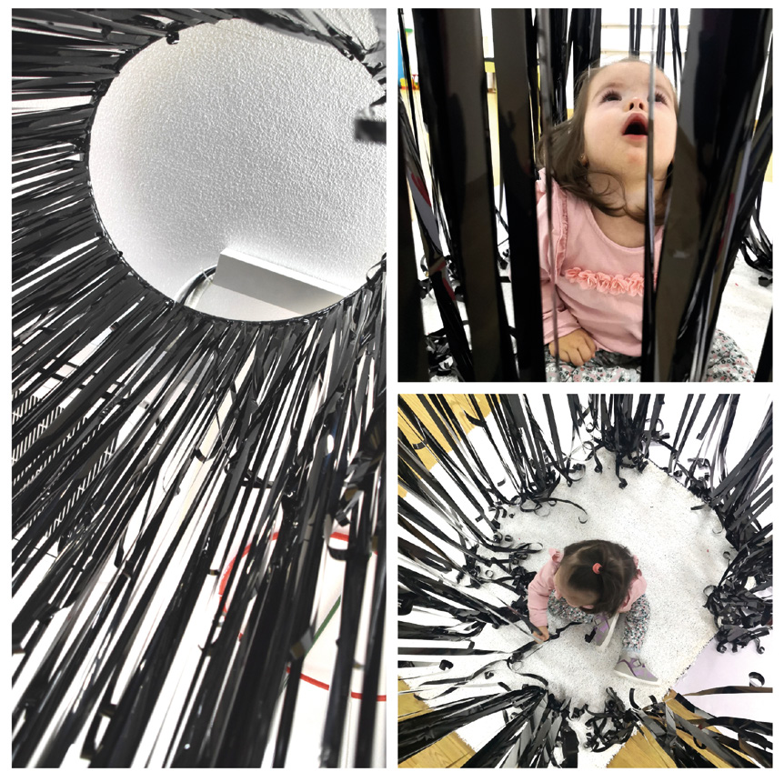 Decidimos limitar las formas y los colores de los espacios con un sentido estético. En los espacios de aprendizaje vertical, fuimos reconociendo que lo estético no es anecdótico, y que debíamos situar el cuidado estético de los ambientes como un elemento esencial. Cada uno de los espacios debe ser cuidado, evitando que los elementos ajenos a la instalación sean una interferencia. De manera que a la hora de construir los ambientes, la luz, la selección de los colores y la forma en la que se sitúan debían tener una razón estética. En la propuesta Jugar para explorar, decidimos combinar los espacios en tres únicos colores: blanco, negro y rojo. Elegimos estos colores porque son los que generan mayor contraste y atención en los infantes, siendo los que mejor son percibidos por los bebés y recién nacidos. La composición de la propuesta artística, la diseñamos con un predominio de formas circulares y líneas rectas, buscando cierta simetría y armonía geométrica. Como si de la creación de un cuadro tridimensional se tratara, en la composición de este espacio inmersivo buscamos abarcar no sólo el suelo, sino también el techo, y en consecuencia todo el espacio de una forma mucho más envolvente, utilizando líneas y formas verticales y horizontales. Jugar para explorar estaba compuesta de tres microespacios colgantes o verticales que incorporan el techo, y tres microespacios horizontales que recuperaban el espacio del suelo como lugar de creación. (Fig.5).
