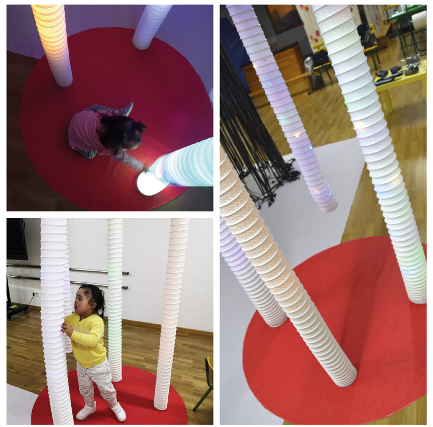 Los espacios colgantes, o verticales, eran tres. El primer espacio estaba construido con cintas de las antiguas películas del tipo VHS. Las cintas de vídeo generan un espacio vertical cerrado, que activaba la posibilidad de lugares para esconderse o habitar desde la intimidad y el recogimiento. Este microespacio se convierte en un espacio multisensorial, donde las cintas de vídeo generan diferentes impresiones estéticas con su movimiento, sonido y sensaciones táctiles (Fig. 6). El segundo microespacio lo componía un aro vertical del que colgaban tuberías flexibles retroiluminadas. Este espacio no era completamente cerrado, como el anterior, pero ofrecía la posibilidad de ser recorrido, atravesado o rodeado. Las luces buscaban la estimulación visual, y los diferentes materiales de las tuberías tenían varias texturas que estimulan el tacto (Fig.7).