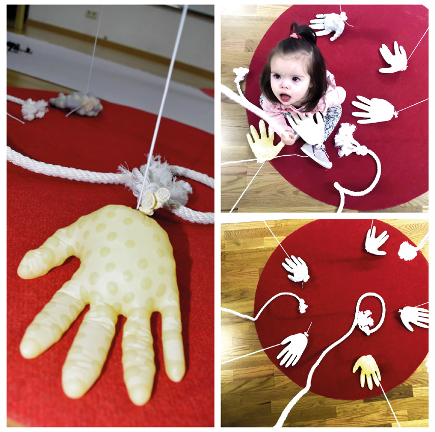 Para el tercer espacio vertical incorporamos guantes sensoriales. Estos guantes de látex habían sido previamente rellenados con diferentes materiales, que estimulaban diferentes sensaciones táctiles: canicas, bolas de gel, algodón, azúcar y harina. Algunos guantes estaban colgados del techo, permitiendo que los infantes pudieran no sólo relacionarse sensiblemente con los guantes, si no también transformar y componer el espacio con ellos. (Fig. 8). Cada uno de los tres microespacios estaba delimitado por una alfombra circular, cada una de ellas de un color, textura y material diferente. Este recurso añadía dinamismo a la composición visual del espacio y permitía diferentes sensaciones cuando el infante gateaba o recorría los espacios. Además de delimitar los diferentes lugares, las alfombras invitan a seguir el recorrido, a desplazarse por ellas o permanecer delimitado en un único microespacio.