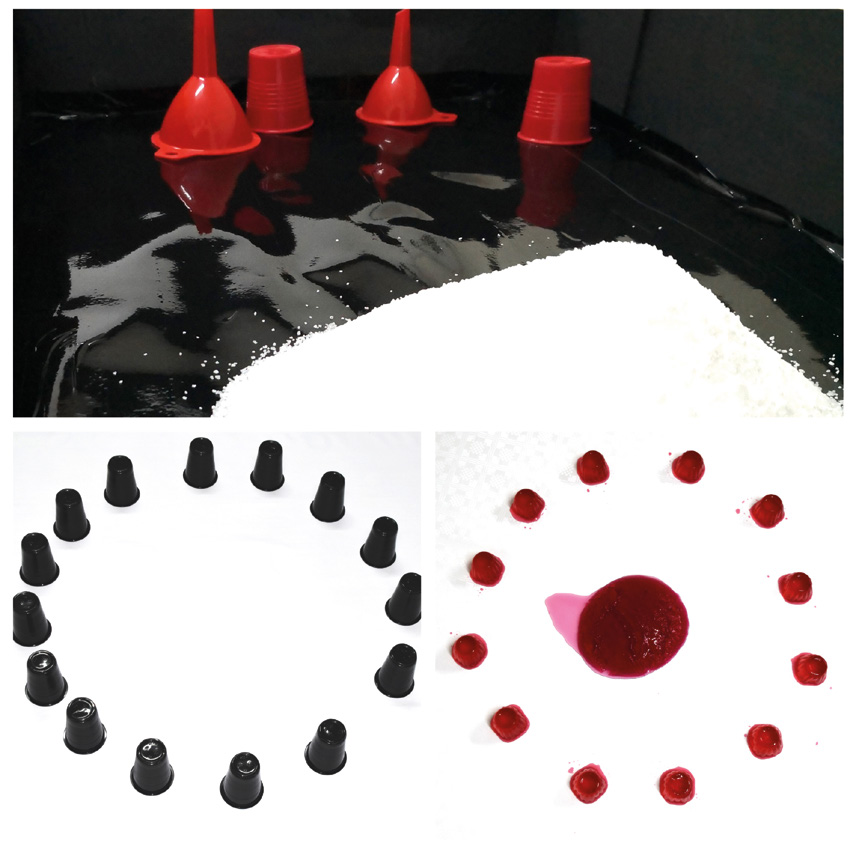 Los espacios horizontales, recordaban a los espacios de exploración vertical que realizamos en la primera etapa. El recorrido se componía también de tres espacios de juego horizontal, el primero era un espacio circular construido con vasos flexibles. Los vasos flexibles amplifican las posibilidades del juego, ya que no sólo permiten ser apilados, sino que pueden ser transformados y utilizados para interaccionar en otros espacios. En el segundo espacio horizontal colocamos un conjunto de cajas que contenían arena imantada y sal. Las cajas constituyen un elemento relevante para estimular la curiosidad de los infantes, además sugieren acciones de construcción, destrucción y reconstrucción. La sal y la arena imantada permiten ocultar y descubrir, y estimulan diferentes experiencias táctiles. La curiosidad invita a los infantes a introducir las manos en las cajas, lo que desencadena el reflejo de presión en los bebés de menos de cuatro meses. En los más mayores favorece acciones de aprendizaje como llenar, vaciar, dejar caer, extender, apretar o dejar marcas entre otras, siendo estas experiencias la antesala del dibujo, la expresión y la simbolización. El último espacio horizontal era una composición circular de gelatinas de fresa. Las gelatinas estimulan el sentido del tacto a través de su textura y su temperatura, ya que las gelatinas están en diferentes estados de congelación. Este espacio estimulaba también el sentido del olfato y el gusto. (Fig.9).