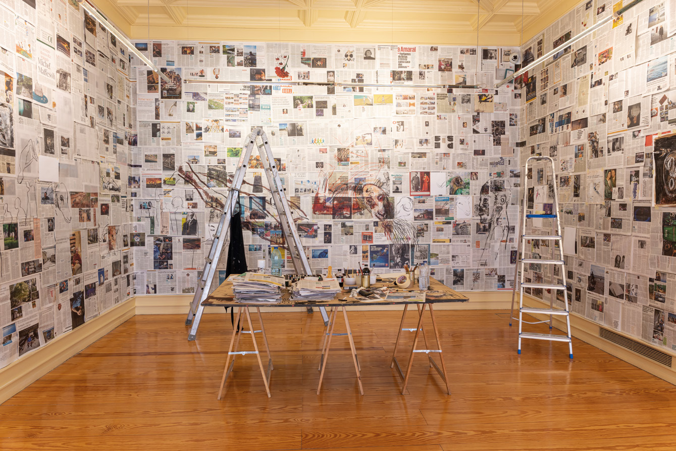 En esta exposición, el visitante también se sorprendía con la sala-instalación (Fig. 1), forrada de hojas de periódico, en la que la pintora revelaba la importancia de la prensa como fuente privilegiada de su obra, combinando esta referencia con recuerdos concretos de su infancia: las cocinas de las casas de Trás-os-Montes que, ennegrecidas por el fuego de chimenea, se pintaban y cubrían con hojas de periódico con ocasión de la gran limpieza anual, en Semana Santa.