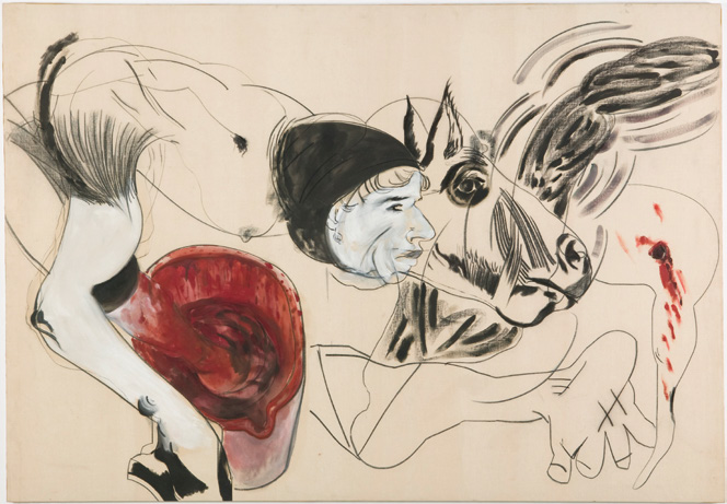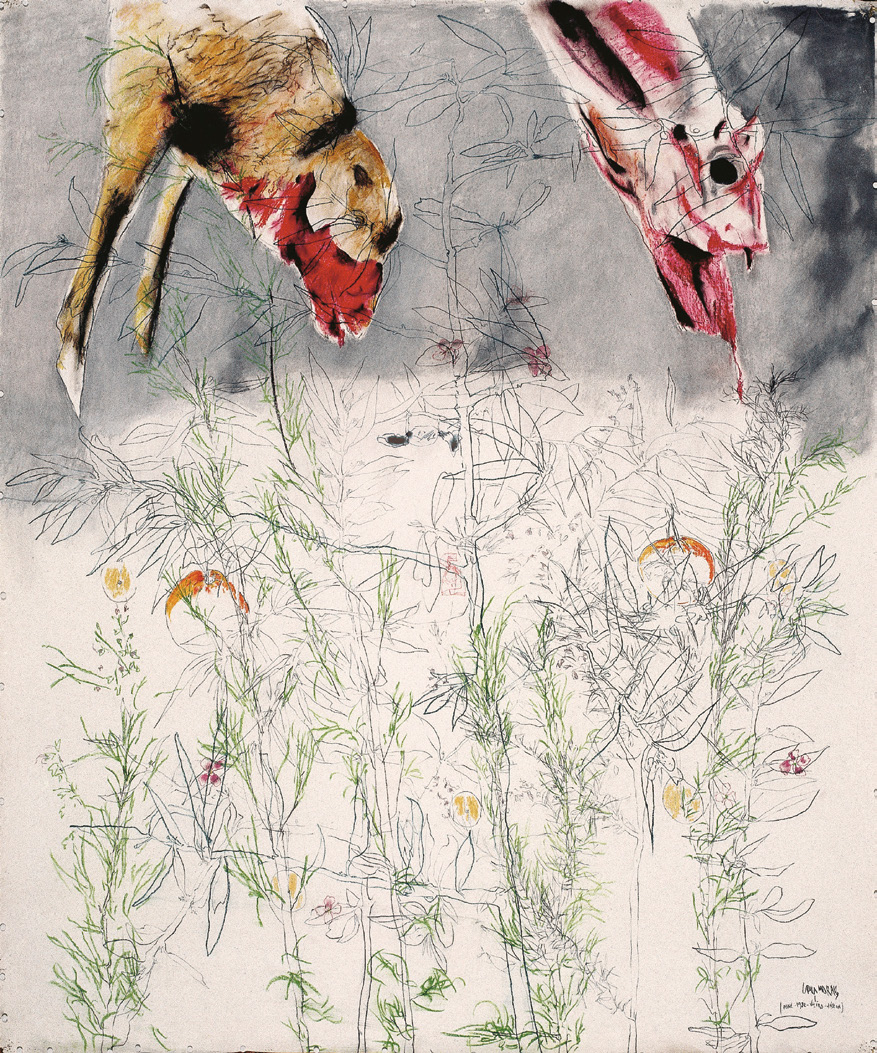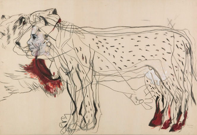 Dice Graça Morais (en Fiadeiro, 1983, p. 15) que «La violencia que padecen las mujeres es muy grande. Primero porque trabajan mucho, segundo porque son víctimas resignadas y sumisas». Debido a la represión que encuentra en las historias de las mujeres de su pueblo, sus representaciones femeninas toman insistentemente la forma de animales, oponiéndose a la figura masculina, que es el cazador, el depredador de estos animales-mujeres. En estas dos pinturas se referencia la violencia latente y la alusión a una «sexualidad brutalista» (Pernes, 2005, p. 14) a través de elementos como picos de pájaros, garras de animales, cascos de bovino. Y, siempre, la presencia de la sangre, que es vida y muerte.