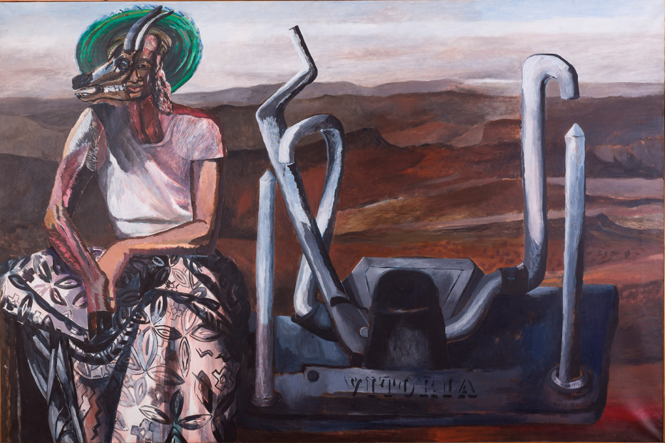 Sin título (serie Cabo Verde), de 1988 (Fig. 5), reúne algunas de estas características. La composición se estructura en torno a los dos elementos que aparecen, sin conexión aparente, en primer plano: la impasible sibila — asumo aquí la definición de la propia artista, para quien «las Sibilas son Mujeres-Animales que representan un bestiario lleno de misterio» (Morais, 2021, p. 27) —, cuya mirada desafía misteriosamente al observador; y un extraño dispositivo de tubos metálicos cuya configuración se asemeja el cráneo de un animal con cuernos. Aquí destaca la palabra VITÓRIA, transferida de una plancha de hierro encontrada por la pintora en la playa de Calhau, en San Vicente. A pesar de la aparente serenidad del paisaje despoblado y monocromático en el que se proyectan los varios elementos, la escena presenta cierta tensión, propuesta visualmente por la luminosidad que destaca en la paleta oscurecida de tonos terrosos y plomizos y, sobre todo, por el desplazamiento del centro compositivo a la izquierda, en el sentido de la mujer-bestia que se enfrenta al observador.