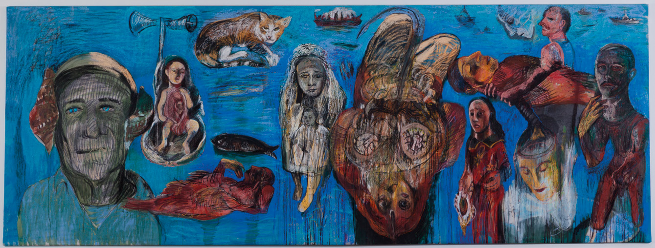 El cuadro Historia Trágico-Marítima, de 2005 (Fig. 6), constituye una síntesis de las investigaciones realizadas en este nuevo territorio geográfico y vivencial. La composición está marcada por el azul de un mar lleno de barcas y hombres (destacando, a la izquierda, el rostro bronceado de un pescador de ojos claros, con caracoles en las orejas), donde habitan misteriosas criaturas metamorfoseadas (las sirenas configuradas en mujer-pájaro y mujer-raya) y otros personajes de una trama fantástica inspirada en historias reales y en uno de los acontecimientos más destacados de Sines: las procesiones de Nuestra Señora de las Salas, que tienen lugar anualmente los días 14 y 15 de agosto. El título —una deliberada cita de una obra histórica y literaria del siglo XVIII en la que se recopilan noticias de los hundimientos de barcos portugueses ocurridos entre 1552 y 16027— y la escala monumental refuerzan el carácter dramático y un tanto operístico de esta pintura, sobre que el artista declararía más tarde: