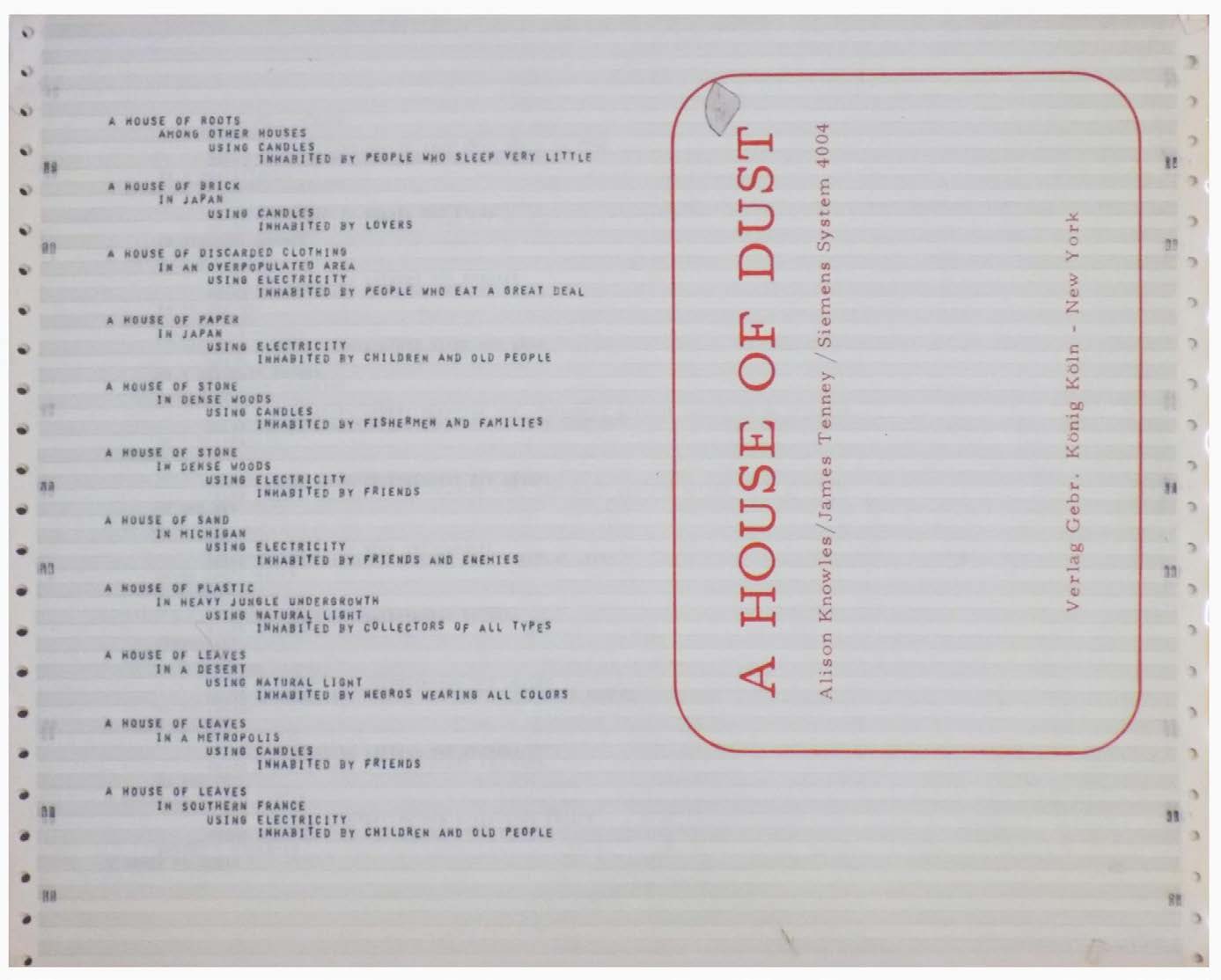 En el invierno de 1967, el compositor James Tenney1 impartió un taller informal en el piso que compartían en Nueva York dos de los principales artistas del entorno Fluxus, Alison Knowles y Dick Higgins. Este fue el germen de A House of Dust (Una casa de polvo)2, un poema computerizado ideado por Knowles y en el que, como explicaremos en las páginas que siguen, cristalizan algunos de los sueños y expectativas que la contracultura del periodo hizo recaer en la tecnología informática como posibilitadora de una idea de textualidad expandida. El taller —al que asistieron, entre otras personalidades, Phillip Corner, Max Neuhaus, Nam June Paik, Steve Reich y John Cage— estaba destinado a mostrar cómo los ordenadores podían ponerse al servicio de la práctica artística mediante la generación de sistemas aleatorios. Así, el texto ideado por Knowles, que se desplegaba en una hoja de papel continúo perforado, consistía en una combinación azarosa de cuatro listas de palabras que, en conjunto, ofrecían numerosas variables de lo que podría constituir un espacio habitable (Fig. 1). Faltaban pocos meses para que el llamado «verano del amor» llegara a las calles de San Francisco, y algo de aquel espíritu de fraternidad y libertad del movimiento hippie impregnaba el poema. Así, mediante una fuente de luz («natural light», «candels», «electricity»), un espacio sobre el que edificar («among hig mountains», «in dense woods», «in an overpopulated area») y cualquier material que se tenga al alcance («plastic», «paper», «sand», «straw» …), el planeta entero se convertía en un hogar donde todos los seres humanos («people who eat a great deal», «fisher men and families», «friends and enemies», «people who sleep almost all the time» ...) encuentran cobijo.